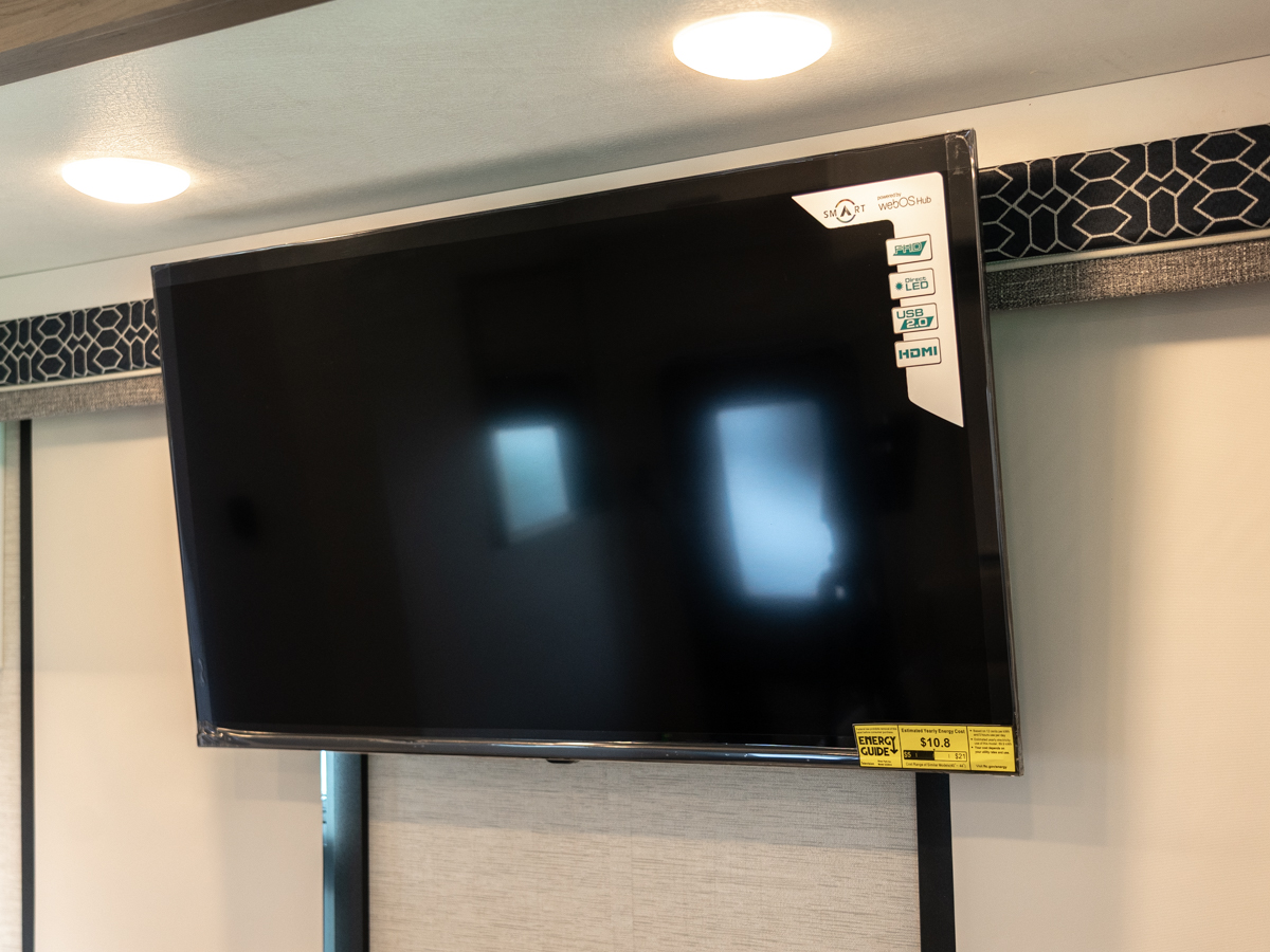You’ll get a flat screen Smart TV in the living area, a 32-inch Smart TV in the primary bedroom, plus most models also sport a 32-inch exterior TV placed right inside the exterior wall.