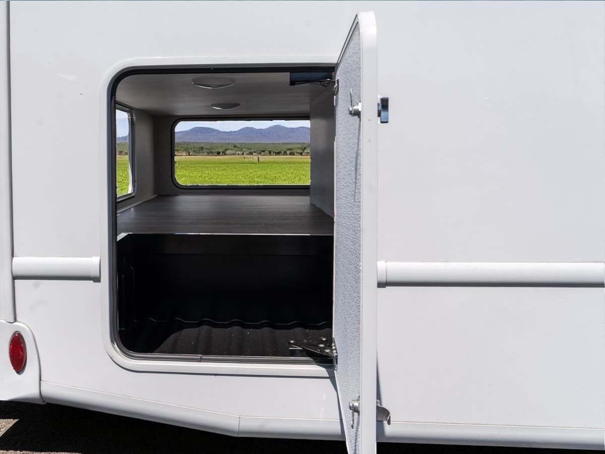 Every Freedom Traveler has an amazing amount of storage, including lighted MEGA-Storage™ with flush mount radius doors for store all your camping gear.