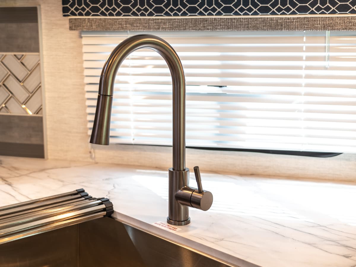 The nickel color finish high-rise kitchen faucet with pull-down sprayer works in conjunction with the double bowl stainless-steel sink to make meal prep and clean-up a snap!