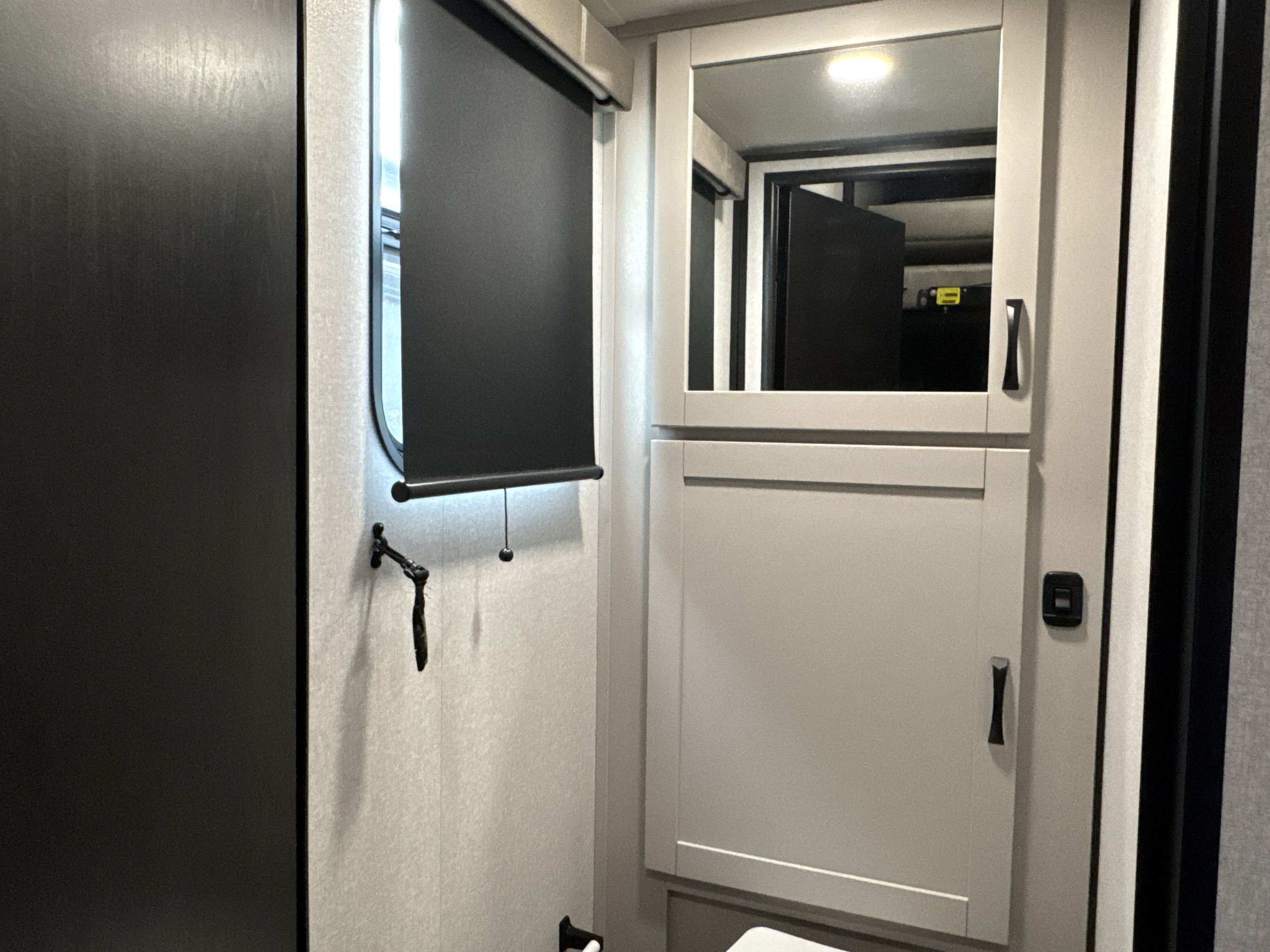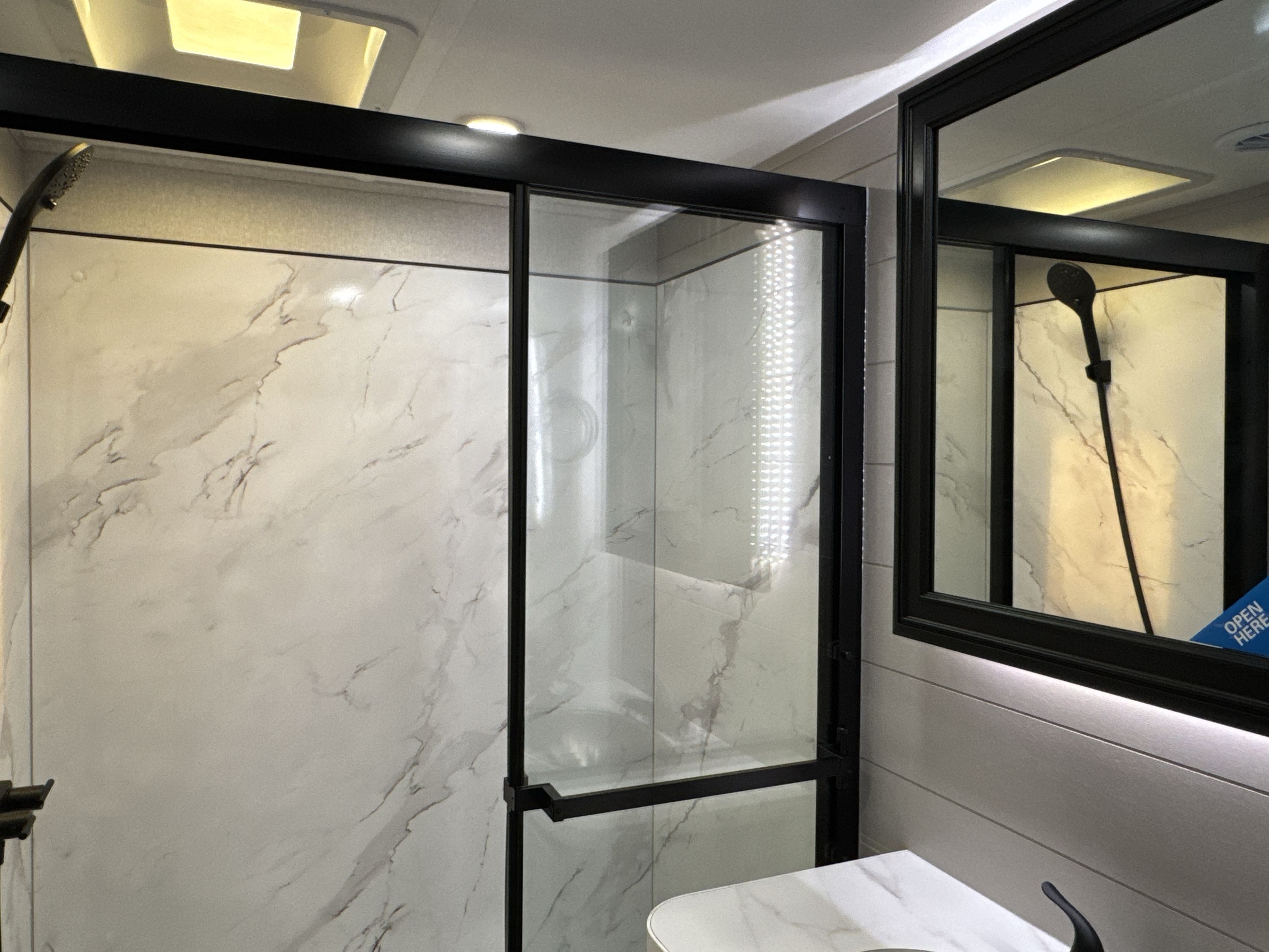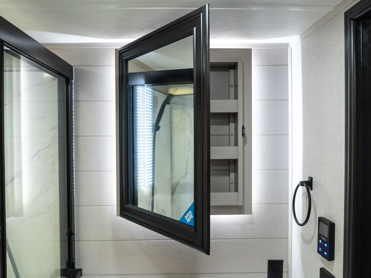 Something not all toy haulers have: a mirrored medicine cabinet, let alone a large one that’s backlit too! Plenty of space for bathing products and scrips!