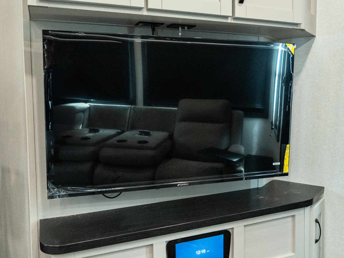 The Seismic 395 boasts a large 4K Smart LED TV with fully digital HDMI output, plus a touchscreen Bluetooth stereo with four speakers!