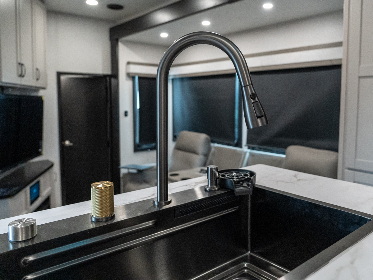 Along with the stainless-steel sink, this high-rise kitchen faucet with pull-out sprayer embedded into the solid surface countertop allows you to easily do food prep and well as clean-up.
