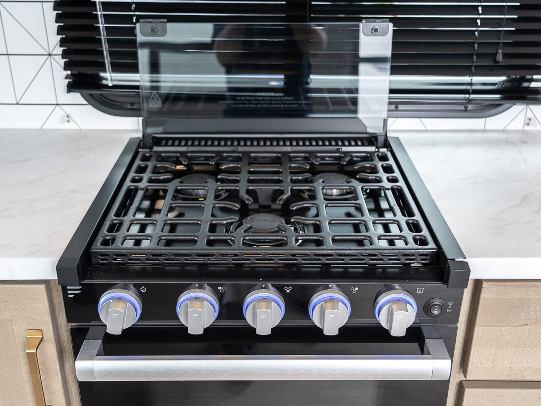 High output and high functionality, the 3-burner cooktop gives you the ability to cook a lot at once. Plus, before the burners are on, the glass cover provides additional space off the seamless countertop to prep your camp meals.