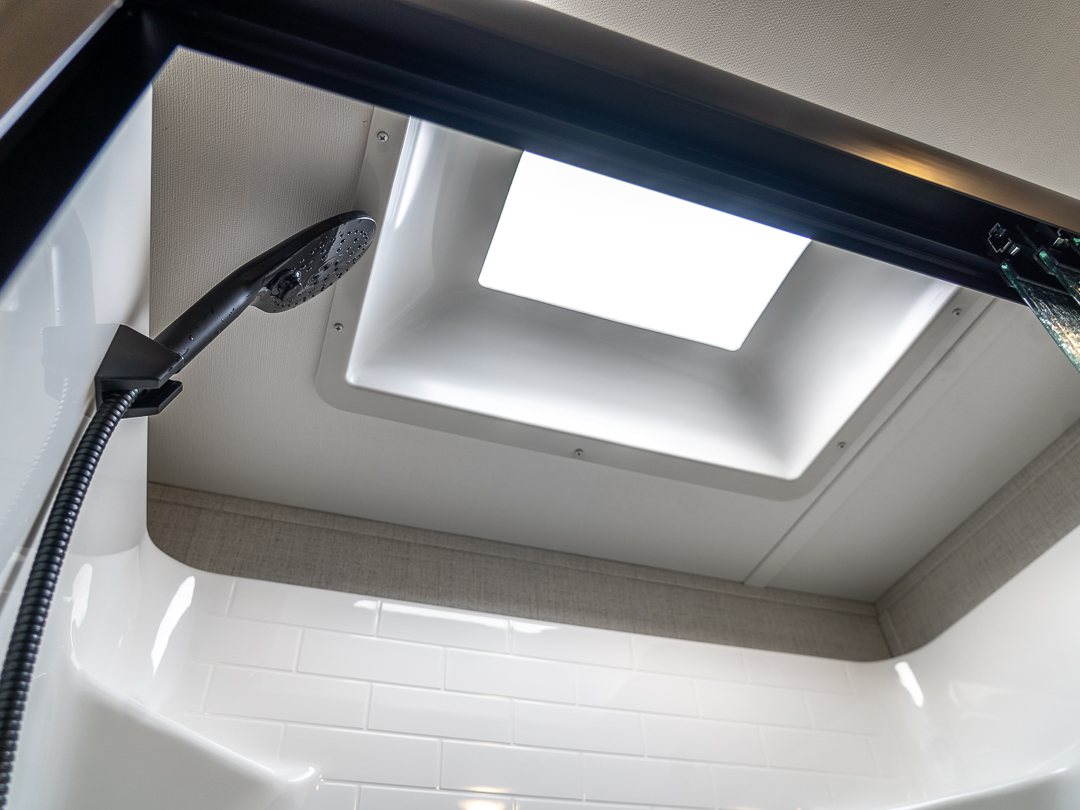 Not only does a skylight in the shower give you some much needed natural light, but it adds a few inches to give you the ability to have a relaxing shower. Not that it’s needed in the Carbon 340. Look at that ceiling height!