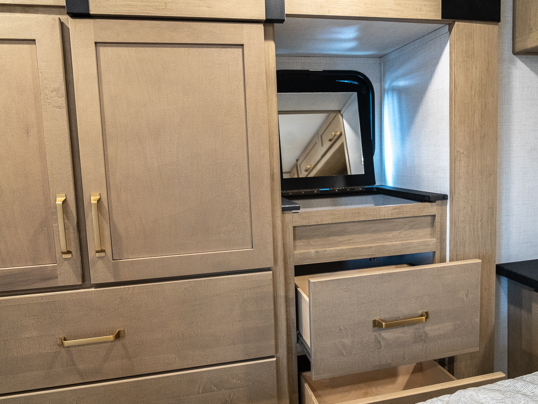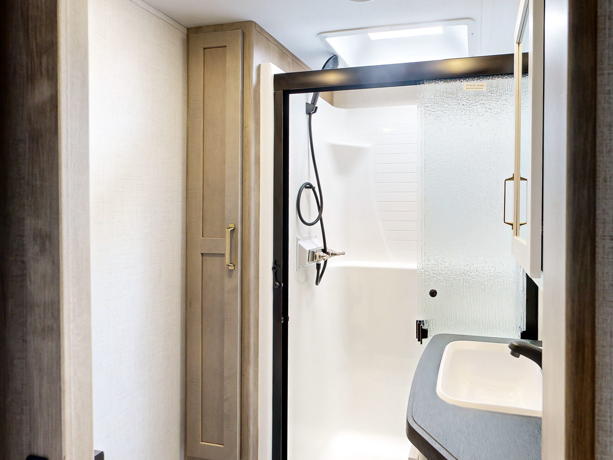 A feature you only know you want when you don’t actually have it, the Carbon 340 has a mirrored medicine cabinet. It’s a huge bonus when you want to look your best while living the RV life.