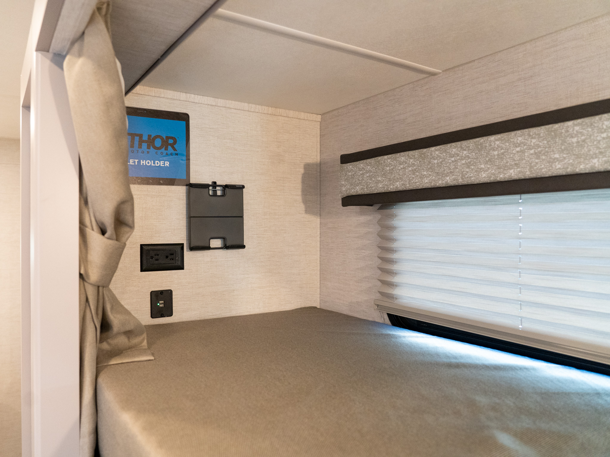 Enjoy the comfort and privacy of curtained bunk beds, perfect for kids and guests. Inside you’ll find power outlets and a mount for a tablet to create two coveted sleeping spots.
