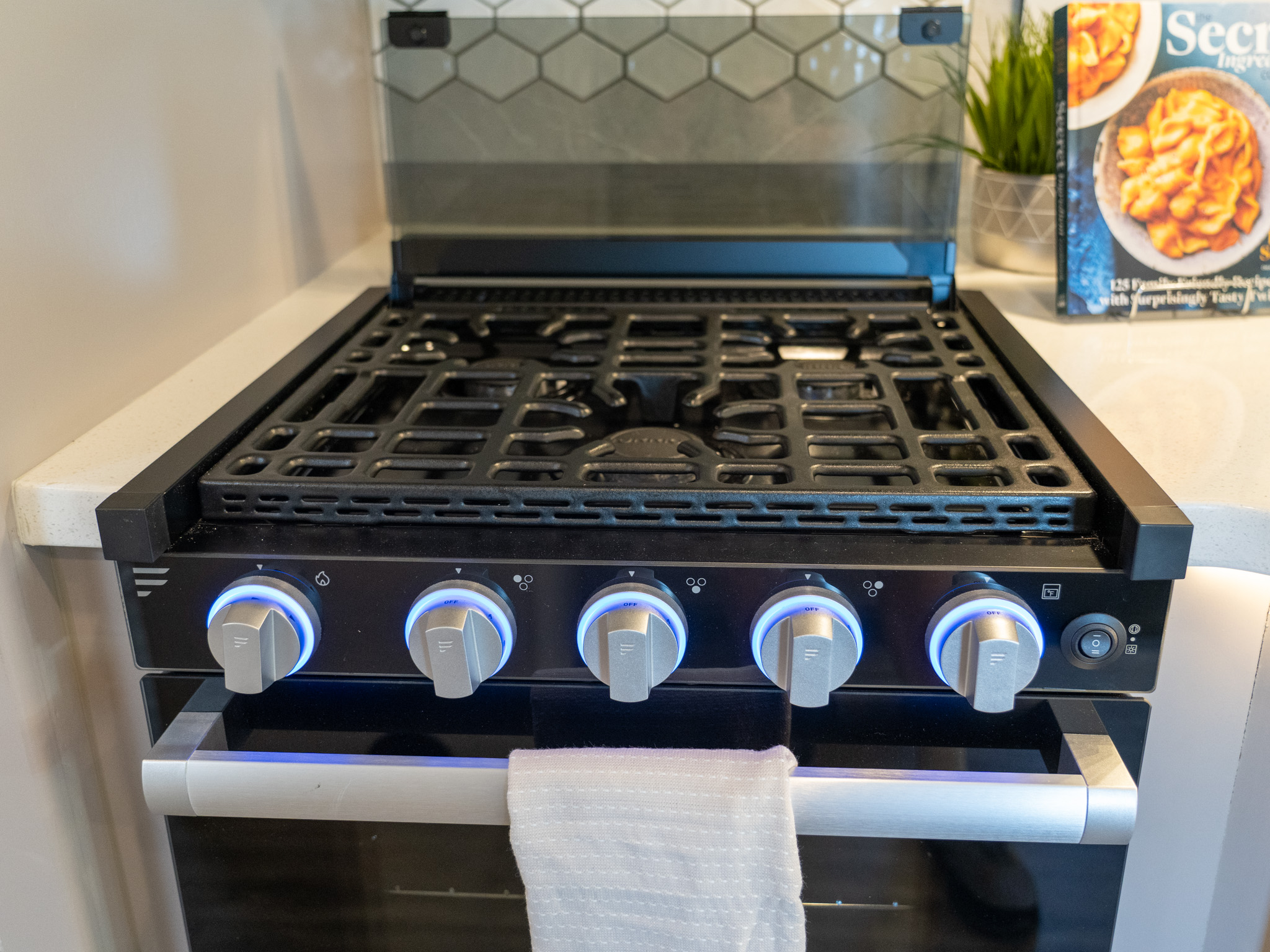 Three very efficient burners topped off with a glass cover. The glass cover doubles as both a prep area when shut, with the burners off, and as a backsplash when cooking to prevent unwanted splatter.