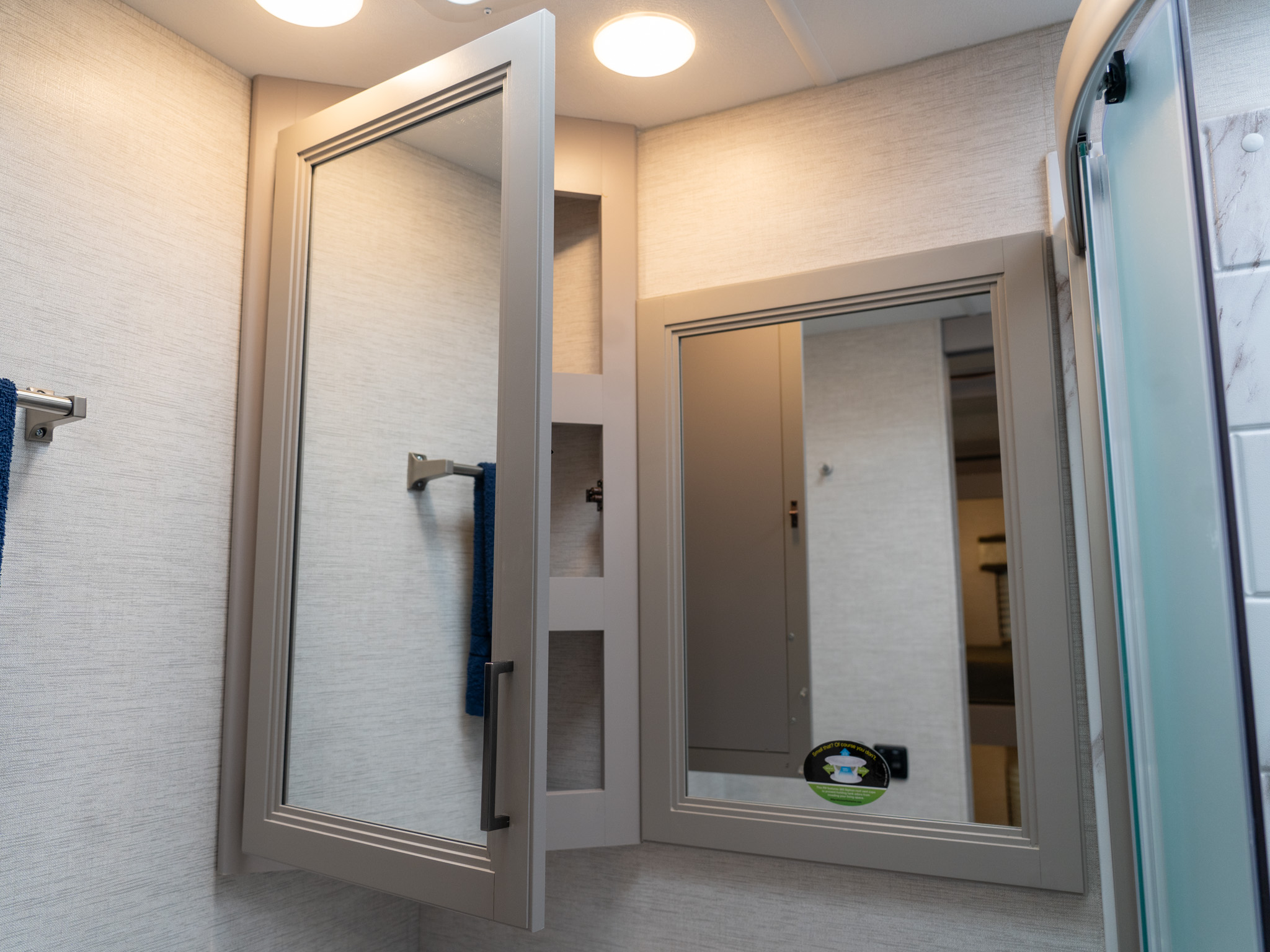 One of the places some manufacturers will cut to save some costs is in the bathroom by eliminating either the medicine cabinet or the costly mirror. Not here. Enjoy your primping time in the Thor Ace 32B.
