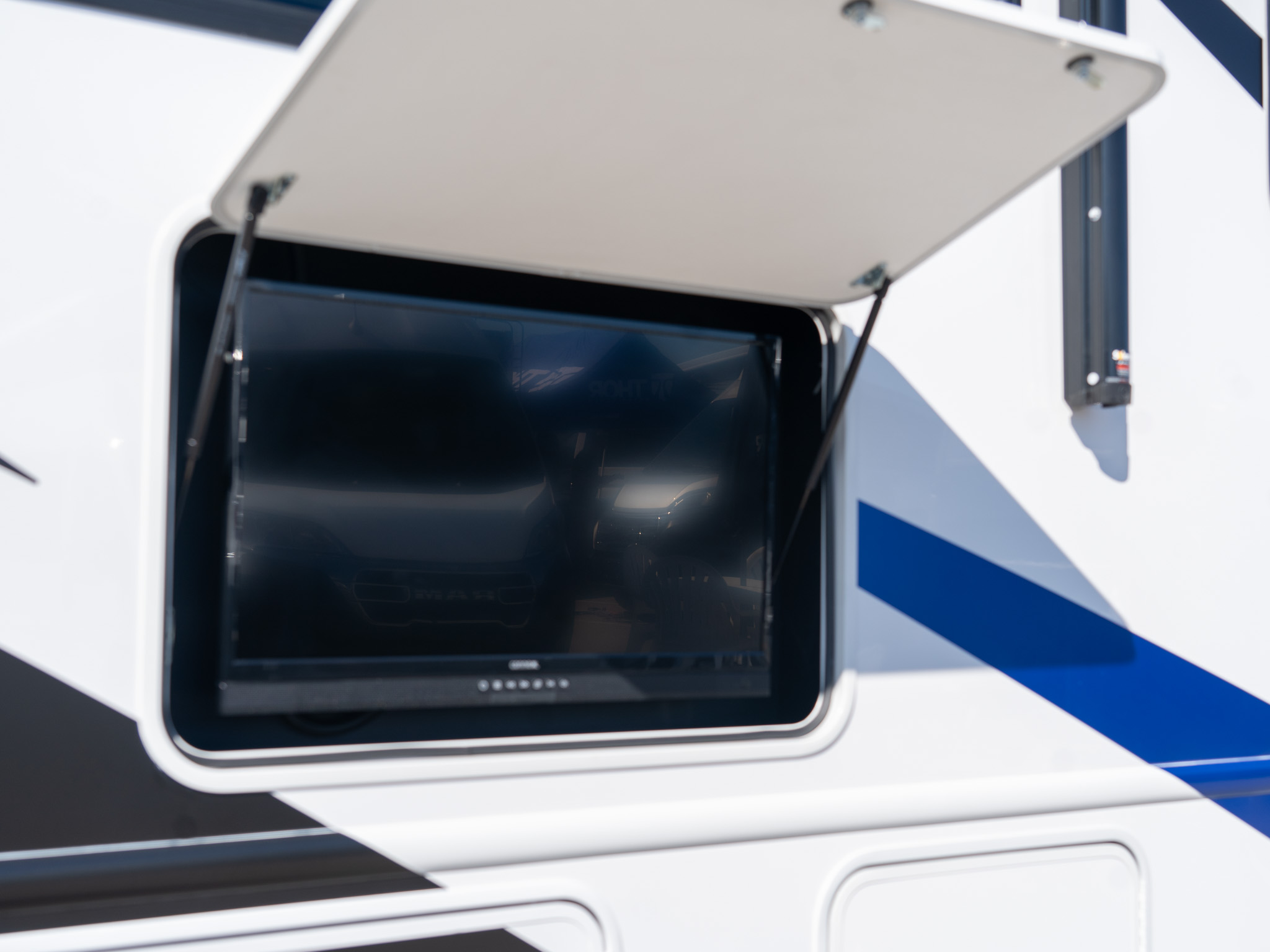 Want to sit under the awning and catch your favorite tv program, sports event, or movie? Simply open the dedicated hatch on the Thor Ace 32B to reveal a built-in outside TV. Invite the neighbors and enjoy.