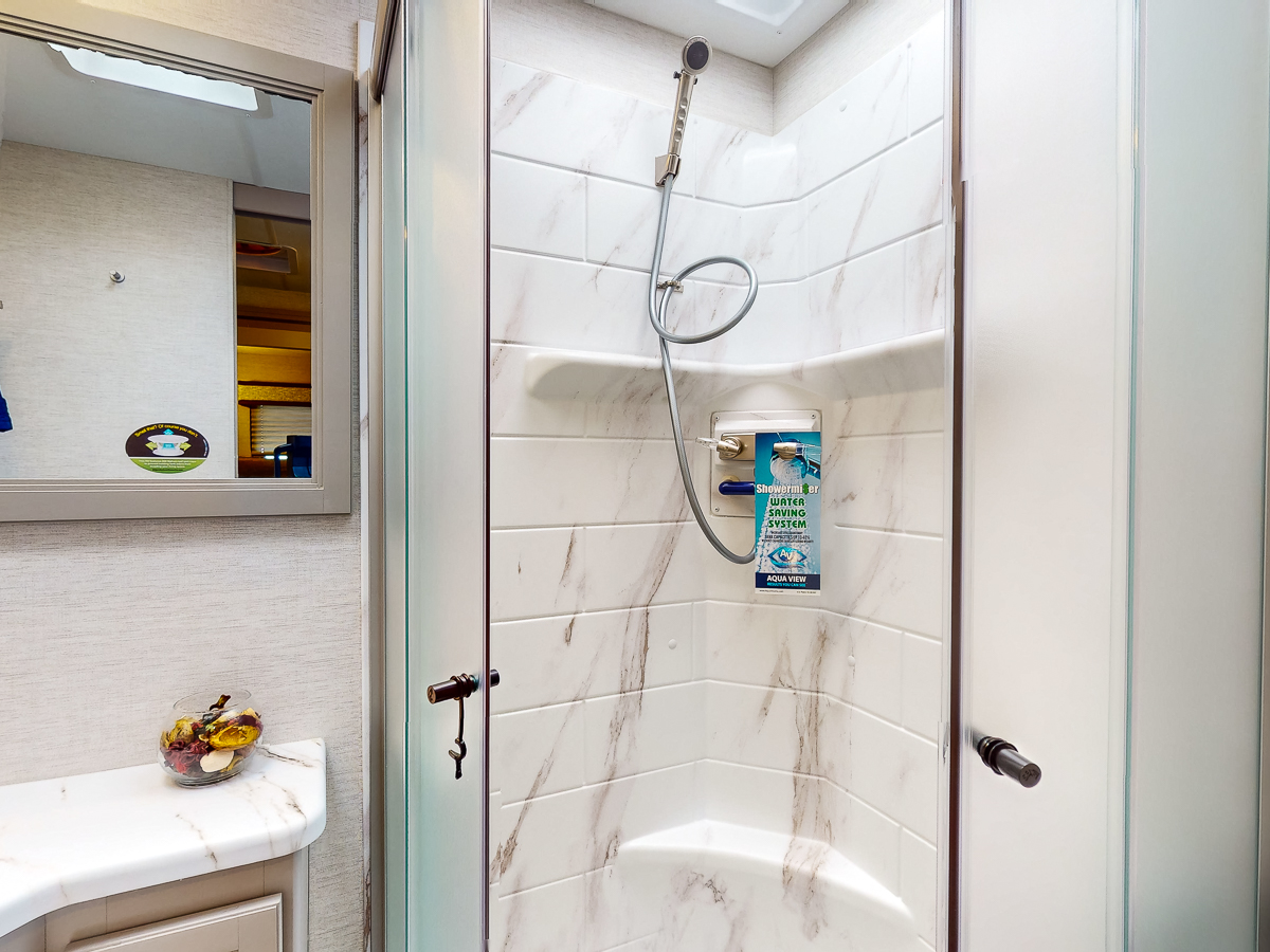 Not only does a skylight situated in the shower give you some much needed natural light, but it adds a few inches to give you the ability to have a relaxing cleanse. Also enjoy a well-placed, removable shower head for extra convenience.