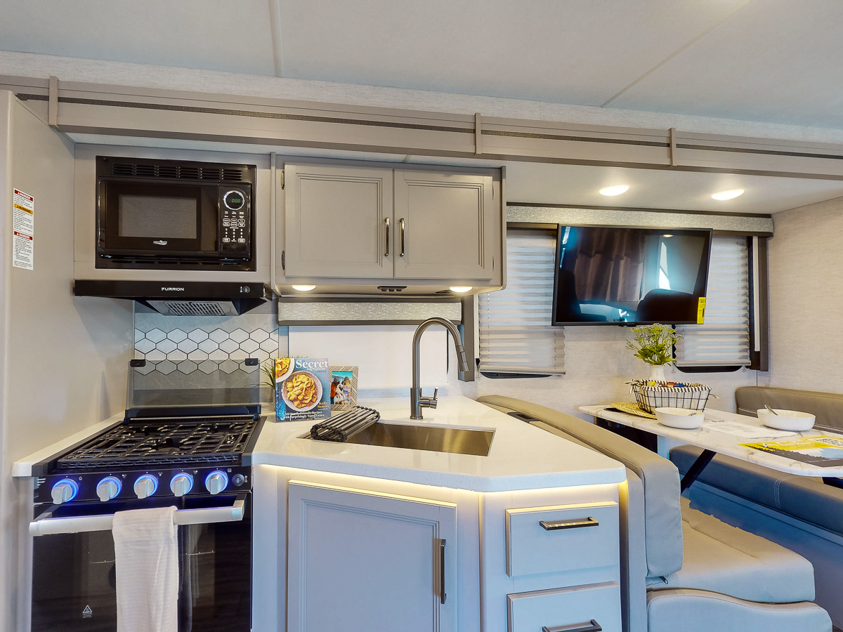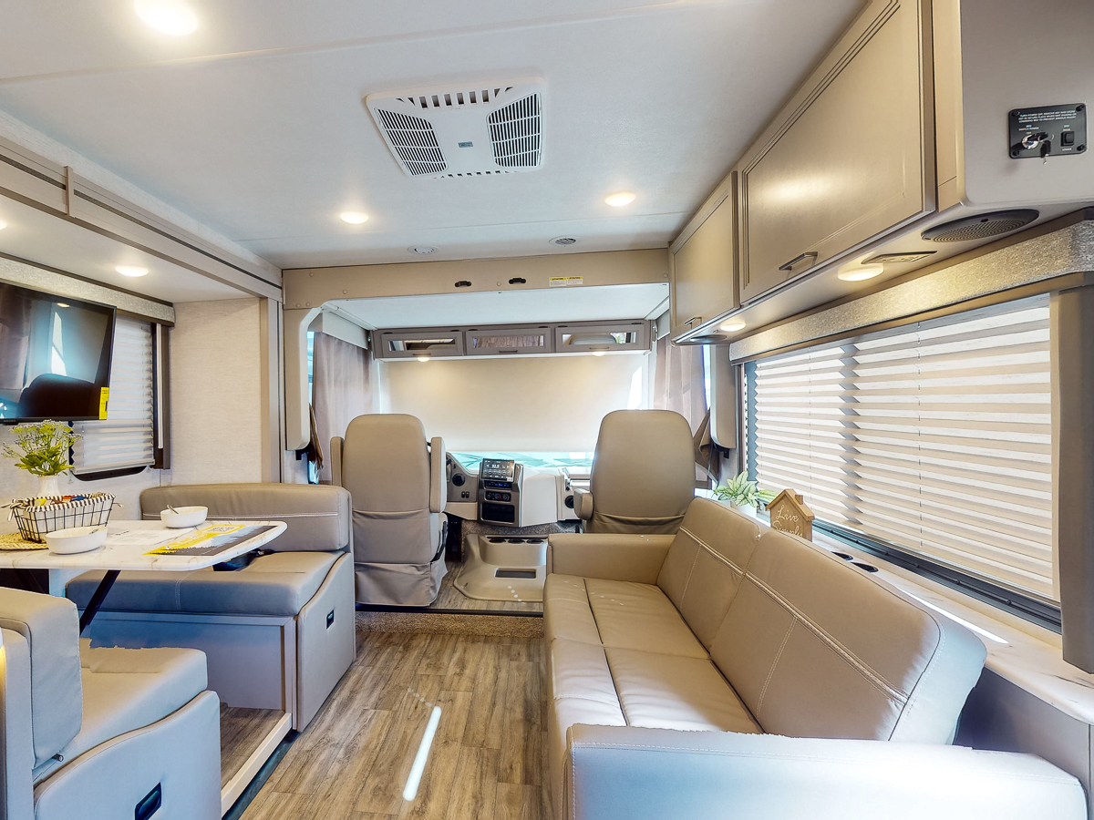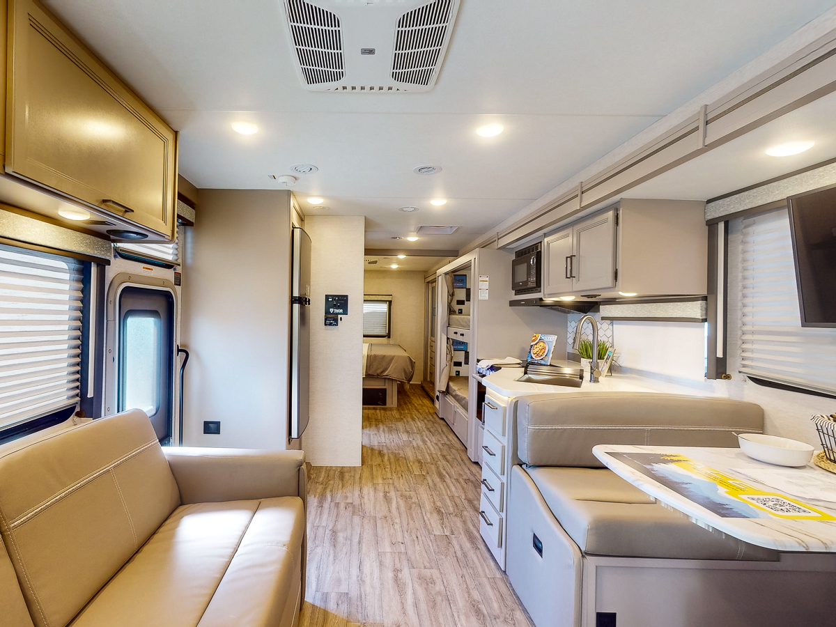 The Thor A.C.E. 32B is a moderate size gas motorhome perfect for the family on-the-go, complete with spacious bunks, a primary king-size bedroom, and every amenity to keep you and family (and pet) comfortable, fed, and entertained. The full wall slide provides a simple extension that has big payoff, allowing for more bedroom, kitchen, and dining space. Enjoy a double-door refrigerator, two LED Smart TVs (bedroom and living room), and comfortable furniture throughout this spacious and well-designed unit. Ready to see more? Check out our overview video, 3-D tour, as well as some of the features you’ll find in the Thor A.C.E. 32B below.