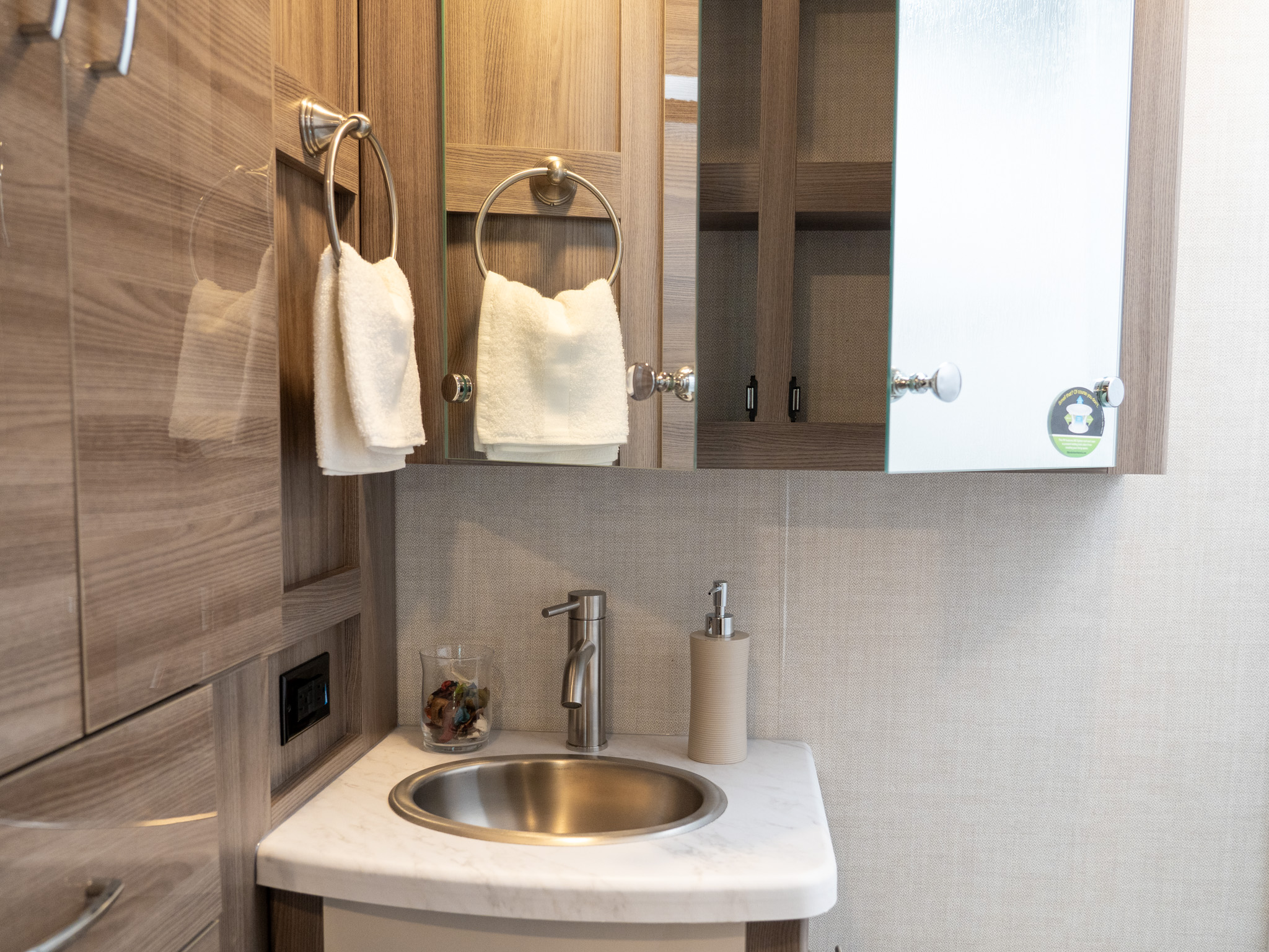 Matching the aesthetic of the sink in the kitchen, this stainless-steel, deep bowl sink in the bathroom is a stylish and practical detail that you and any visitors will appreciate.