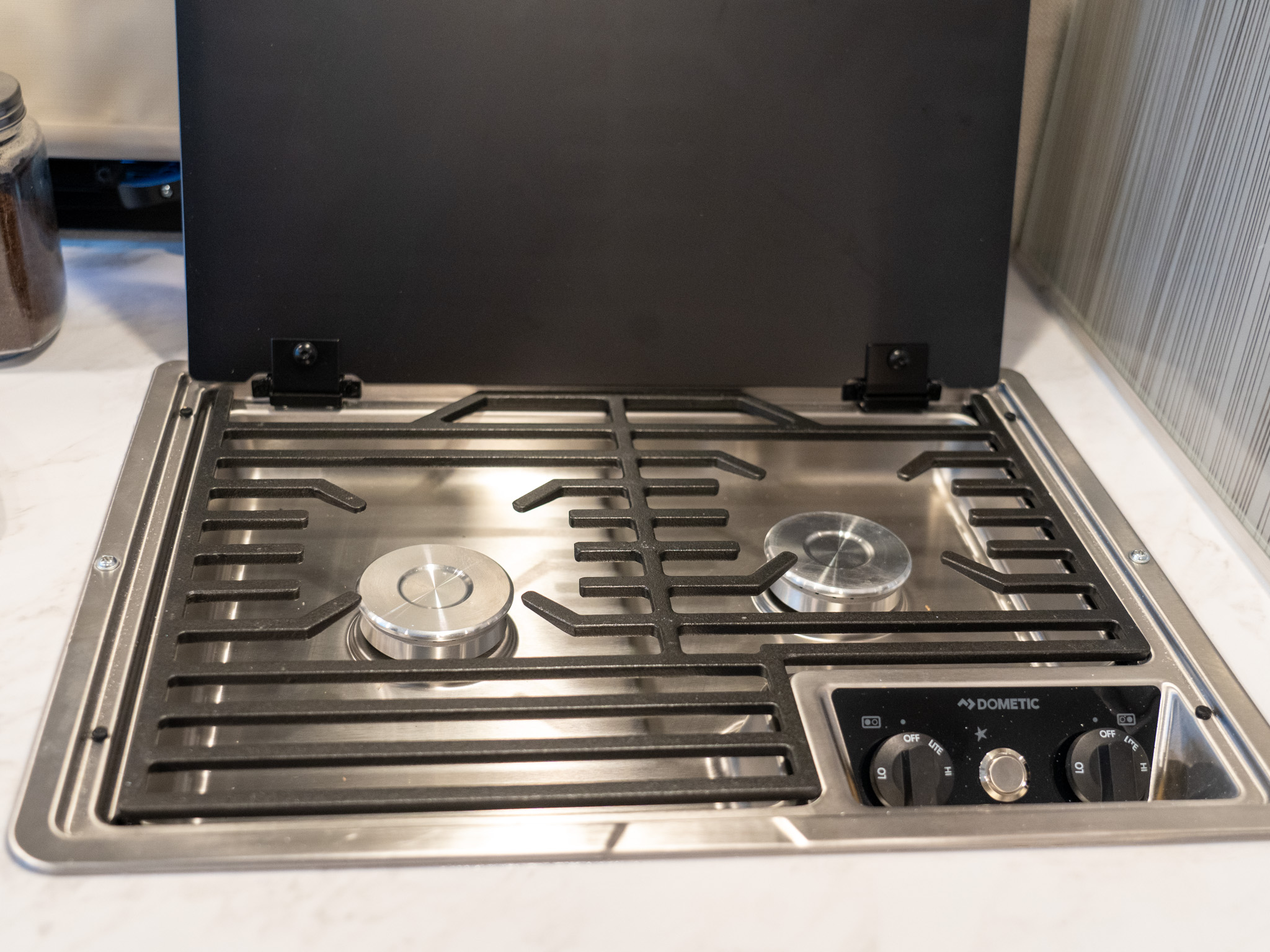 A pair of very efficient burners is topped off with a glass cover. The glass cover doubles as both a prep area when shut with the burners off and backsplash when open and you’re cooking splattery foods like bacon.