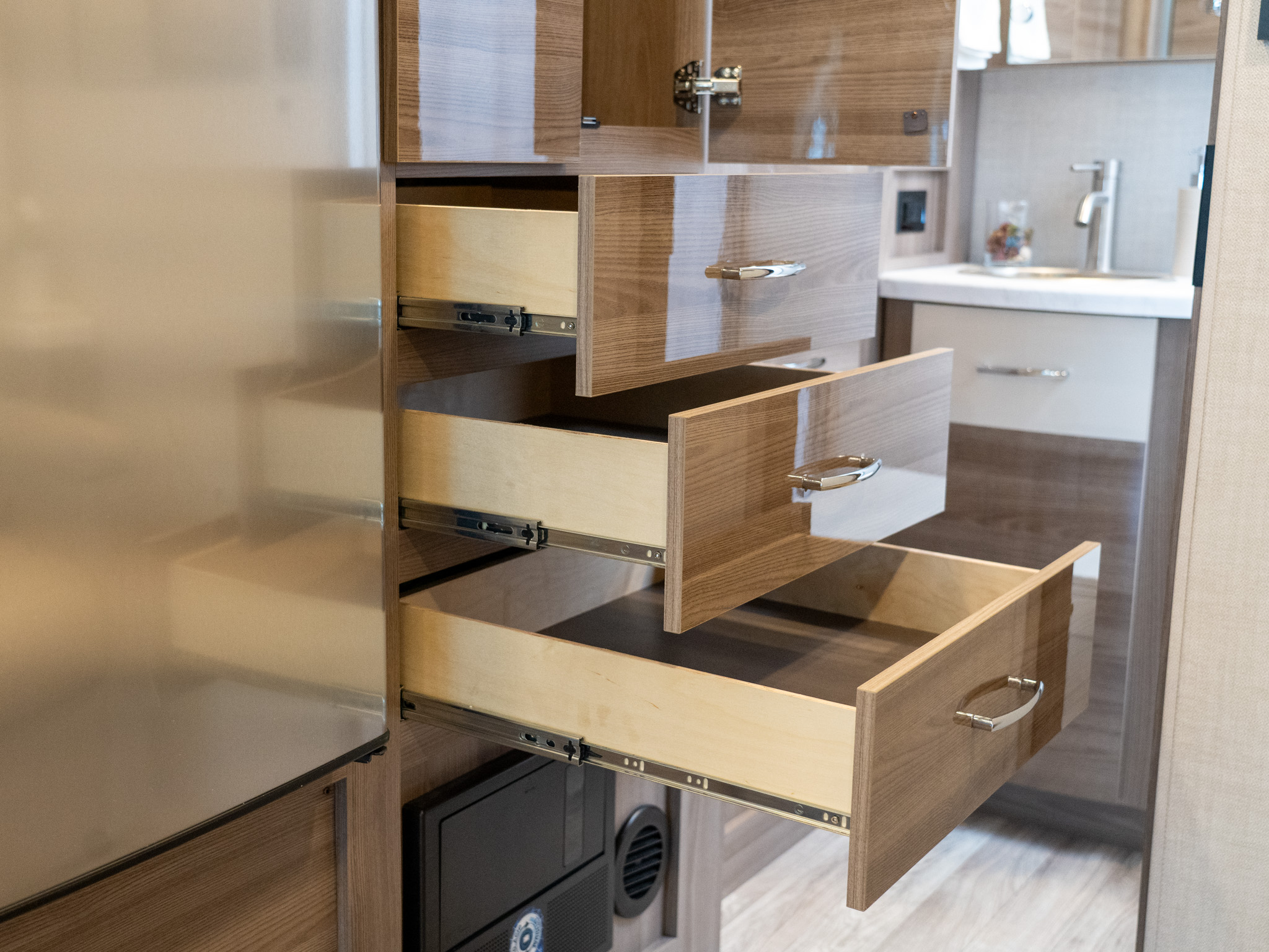 Drawers under the dinette and in the kitchenette pull all the way out with ease due to full extension drawer guides. As such, storage of pots, pans, kitchen utensils, clothes, and more is a whole lot easier as is their retrieval.