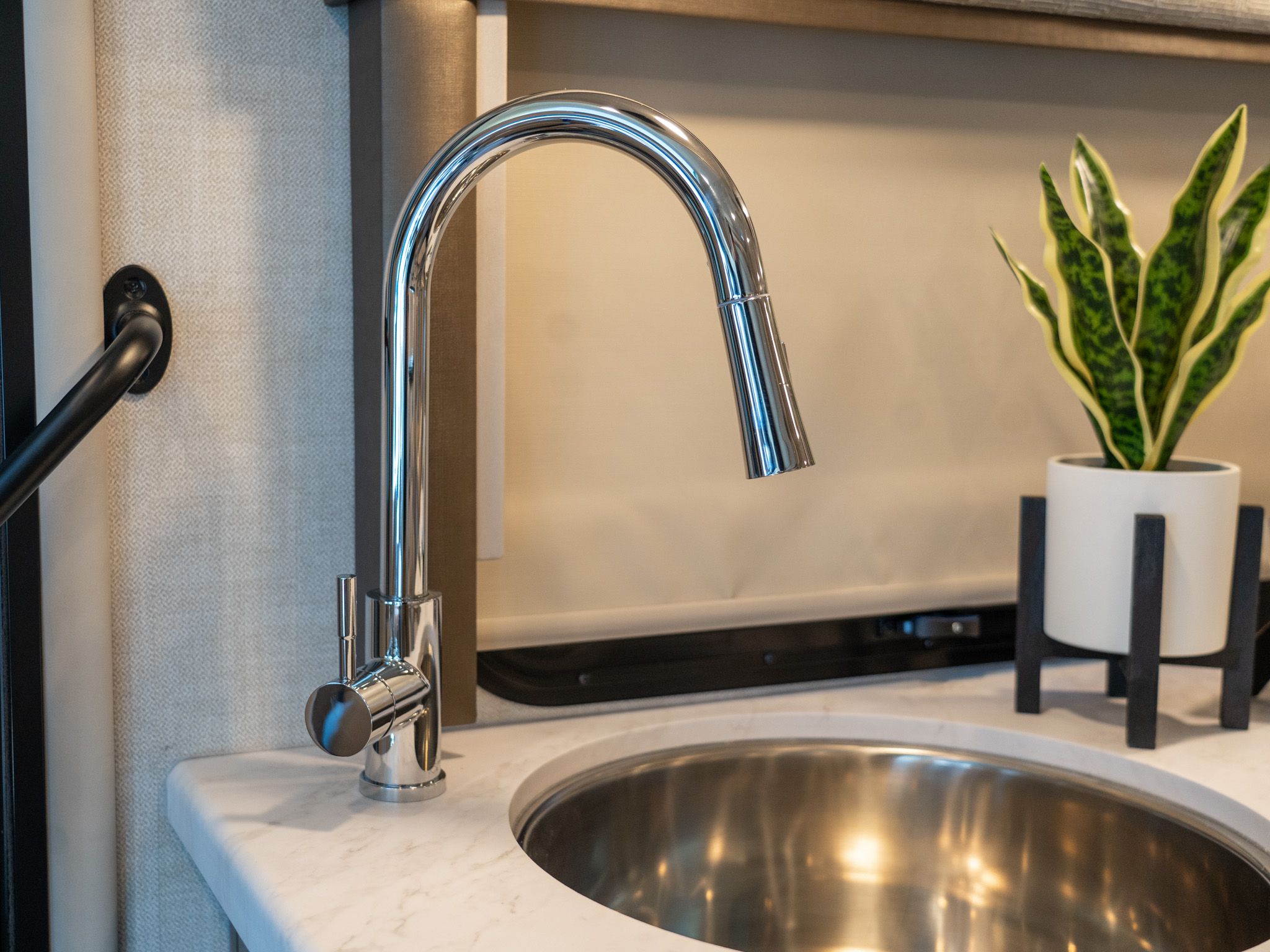 The high-rise pull-down kitchen faucet works in conjunction with the deep stainless-steel bowl sink making washing and clean-up a snap.