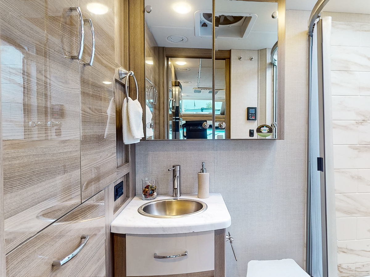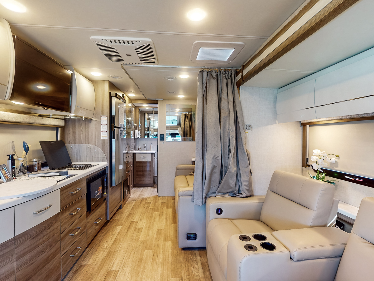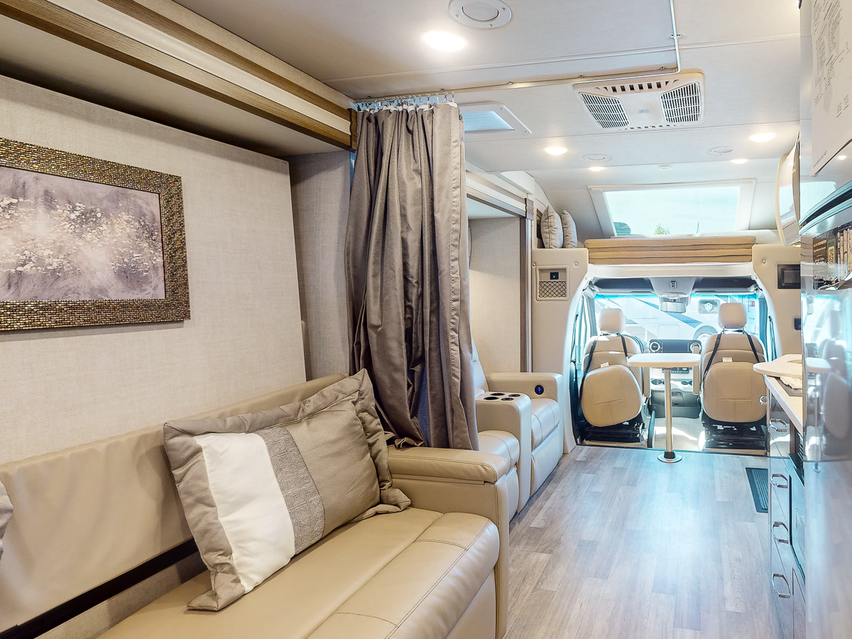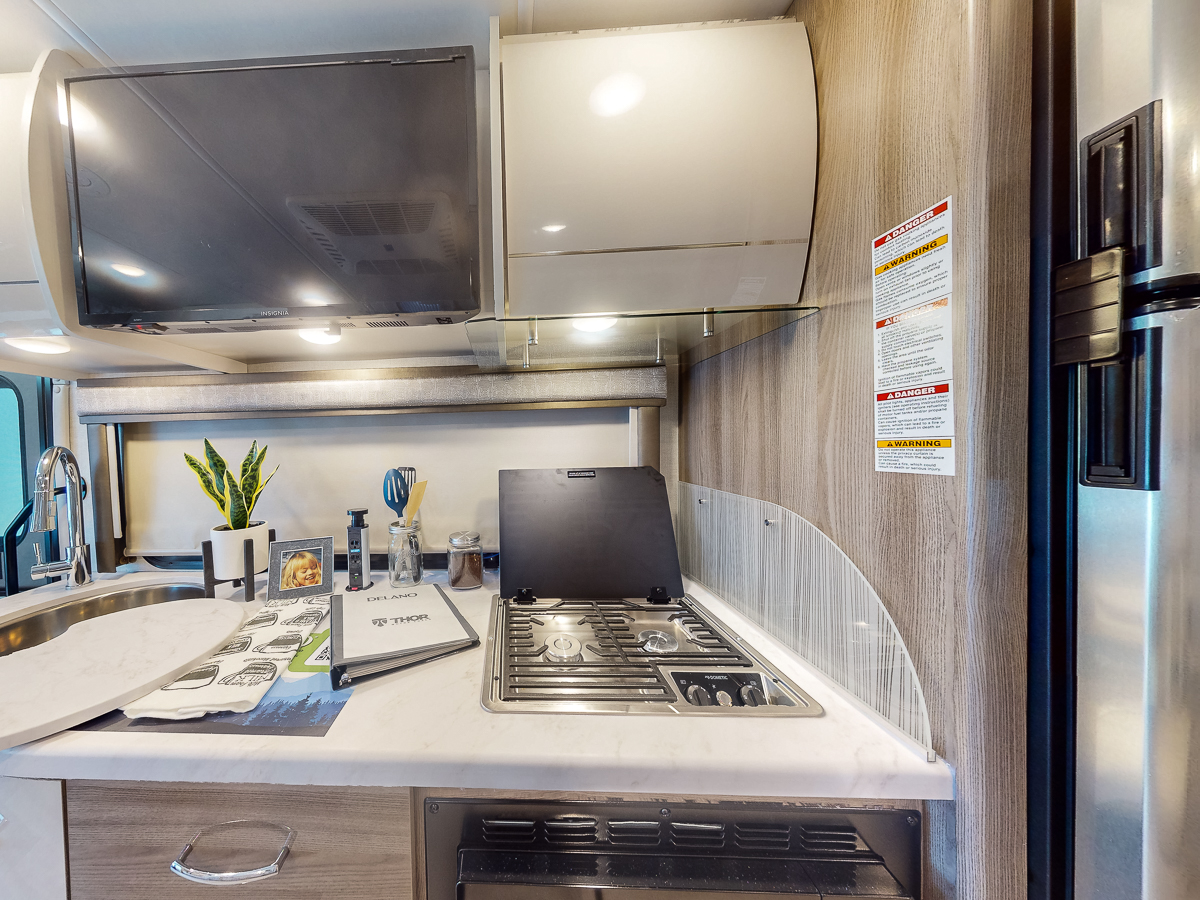 The Thor Delano 24FB is the ultimate nimble Mercedes Sprinter diesel Class C RV, perfect for those who want the comforts of a Class C without the additional length or extra interior space to manage. Enjoy the cab-over bunk featuring a wide, built-in skylight, which makes the living area feel larger and gives guests a stunning view from their sleeping quarters. And you’ll love the standard euro-style glossy cabinetry lining the kitchenette and bathroom with the slightest, stylish curve, adding a sheen effect to this already luxurious motorhome. Ready to see more? Take a look at our walkthrough review, 3-D tour, and feature list below!