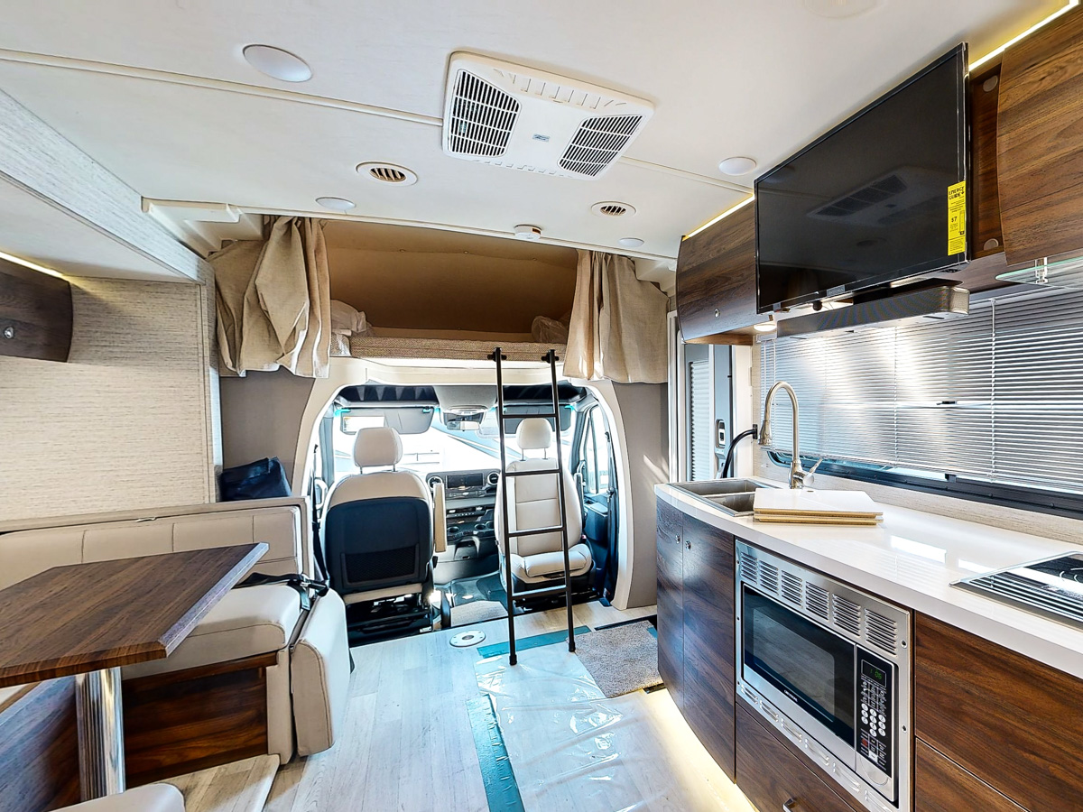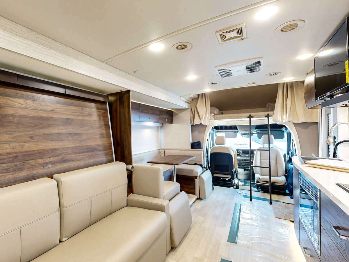 A name synonymous with motorcoaches? Oh, it’s Winnebago 24/7. When you’re ready to hit the open road as a traveling couple, check out the Winnebago View 24D. With the Mercedes-Benz Sprinter chassis, the View 24D is diesel-powered and replete with the fine touches making a Mercedes so special. The View 24D has a wall slide and Murphy bed giving you room in the cabin. With the primary bed, u-shaped dinette and cabover bunk you can sleep up to 6… if you want. A nice convenience is the moveable pedestal table which adds a little coffee or dining space. Check out some great View 24D features as well as the 3-D tour on this page!